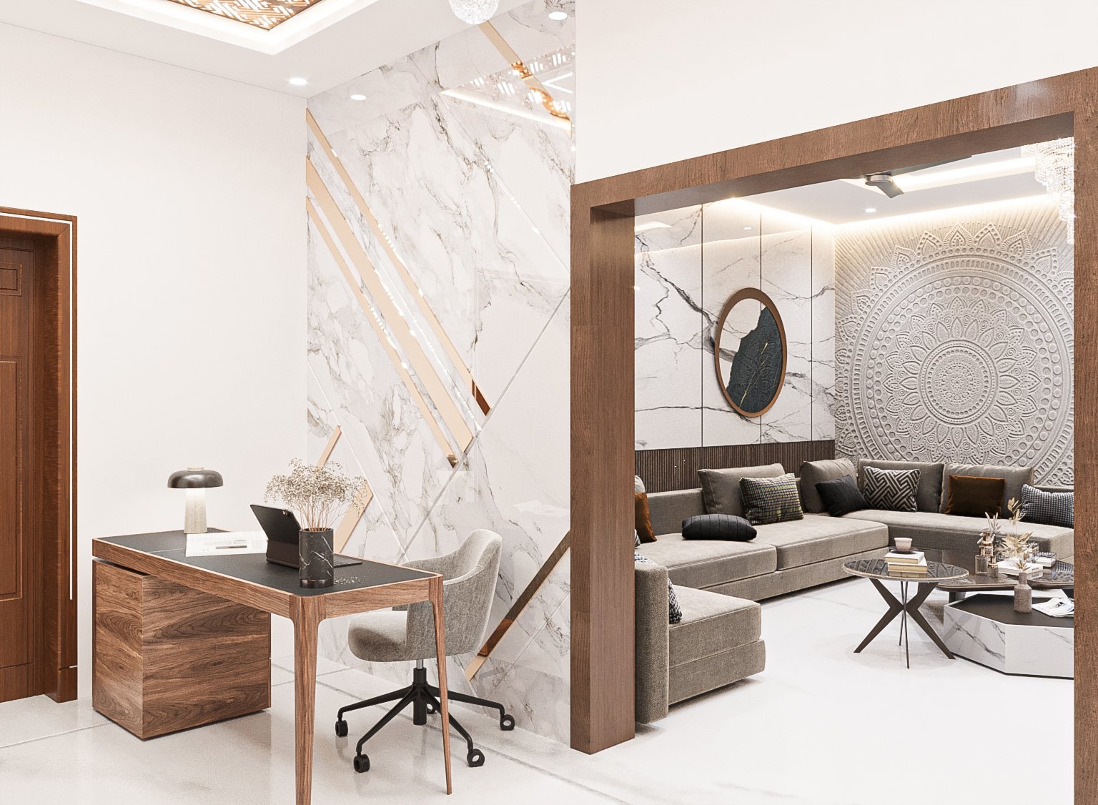 From the living room to the dining and work area, every space in Deepthi Srinivas House is designed with a refined balance of comfort and contemporary elegance. The living area showcases a striking marble-TV wall paired with warm wooden tones and a crystal chandelier that adds a luxurious visual impact.